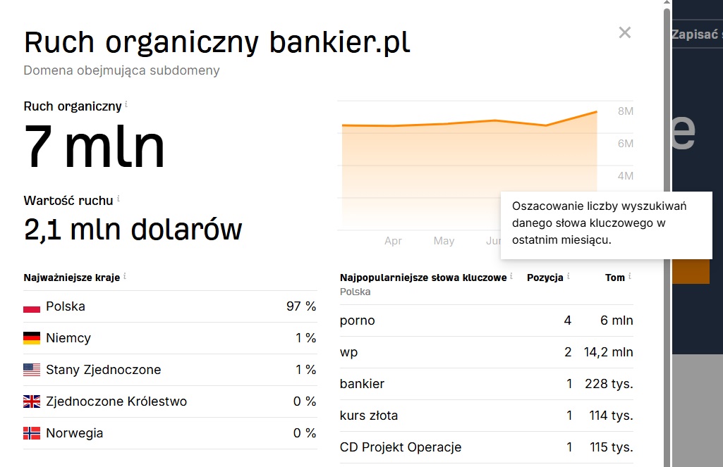 Według danych z Ahrefs, jednego z najpopularniejszych i najbardziej zaufanych narzędzi do analizy ruchu w wyszukiwarkach, portal Bankier.pl generuje około 7 milionów organicznych wejść miesięcznie. Wartość tego ruchu oszacowano na ponad 2,1 miliona dolarów miesięcznie, co czyni ten serwis jednym z najskuteczniejszych graczy w polskim SEO.