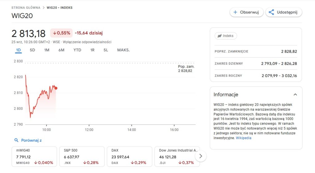 Warto wiedzieć: Choć WIG20 skupia największe spółki w Polsce, to w rzeczywistości odpowiada tylko za ok. 70–75% obrotów na warszawskiej giełdzie. Co ciekawe, w historii indeksu zdarzało się, że jedna decyzja Rady Polityki Pieniężnej lub publikacja danych o inflacji potrafiły w ciągu kilku minut „przesunąć” wartość WIG20 o kilkadziesiąt punktów. To pokazuje, jak silnie reaguje on na wydarzenia makroekonomiczne.